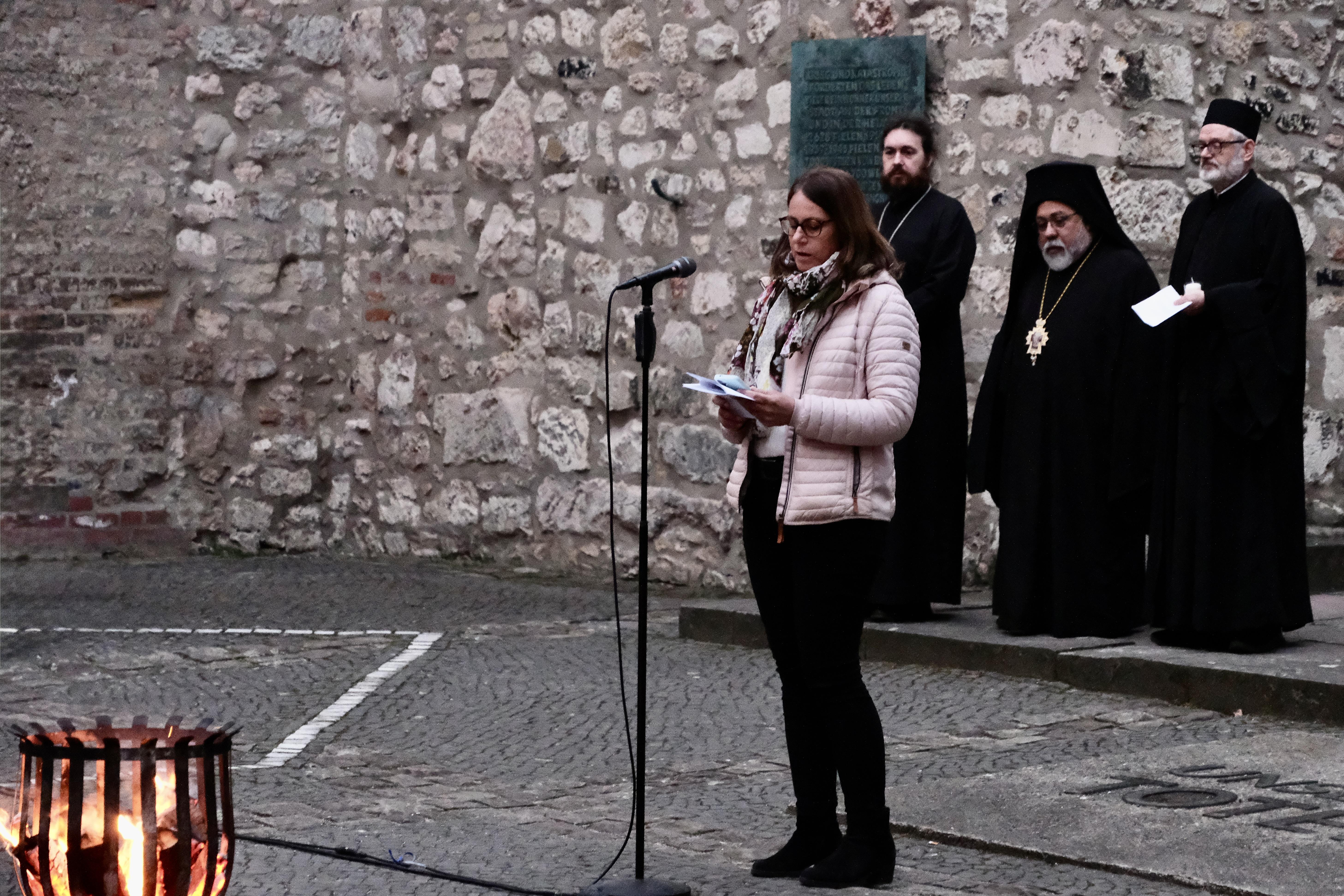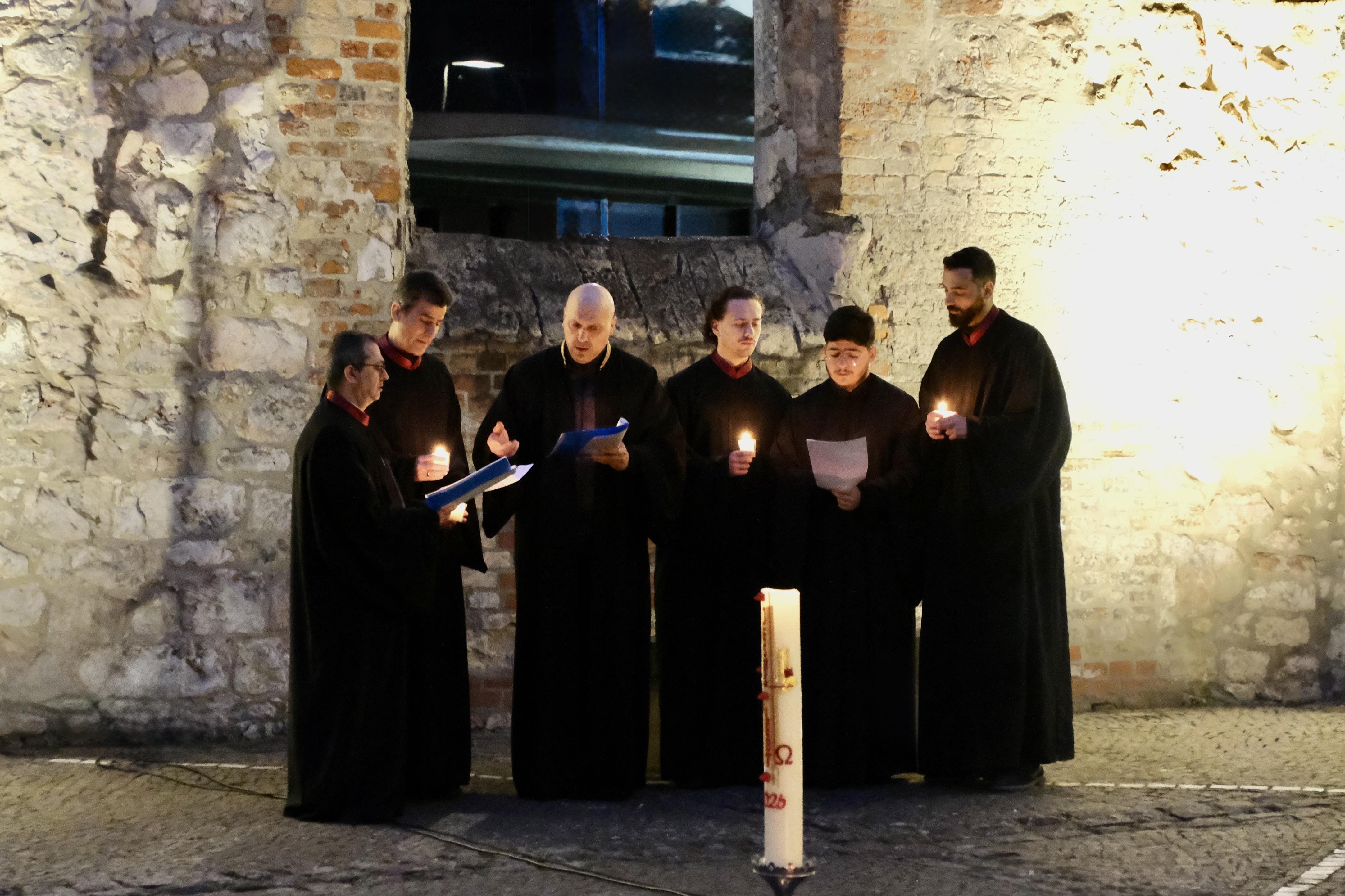 Neben weiteren liturgischen Elementen wurde das Osterevangelium (Lukas 24) verlesen. Im Anschluss erhielten alle Teilnehmenden während der musikalischen Begleitung ein Osterlicht, das am Osterfeuer entzündet und an die versammelte Gemeinde weitergegeben wurde. Bereichert wurde der Gottesdienst durch Gesänge der Schola, einer kleinen liturgischen Sängergruppe der griechisch-orthodoxen Kirche. Die musikalische Begleitung der liturgischen Gesänge der Gemeinde übernahm ein Akkordeonspieler.