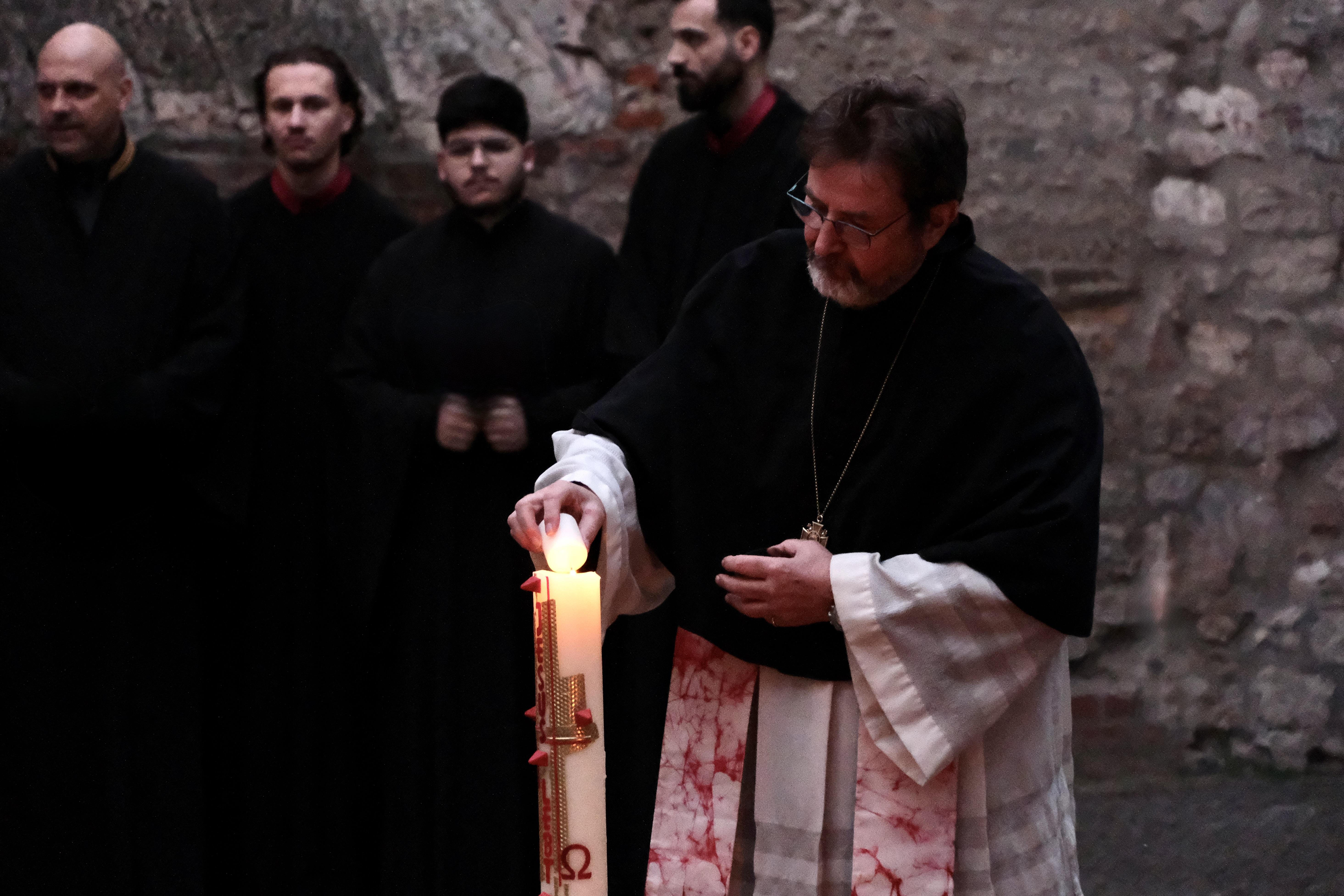 Neben weiteren liturgischen Elementen wurde das Osterevangelium (Lukas 24) verlesen. Im Anschluss erhielten alle Teilnehmenden während der musikalischen Begleitung ein Osterlicht, das am Osterfeuer entzündet und an die versammelte Gemeinde weitergegeben wurde. Bereichert wurde der Gottesdienst durch Gesänge der Schola, einer kleinen liturgischen Sängergruppe der griechisch-orthodoxen Kirche. Die musikalische Begleitung der liturgischen Gesänge der Gemeinde übernahm ein Akkordeonspieler.