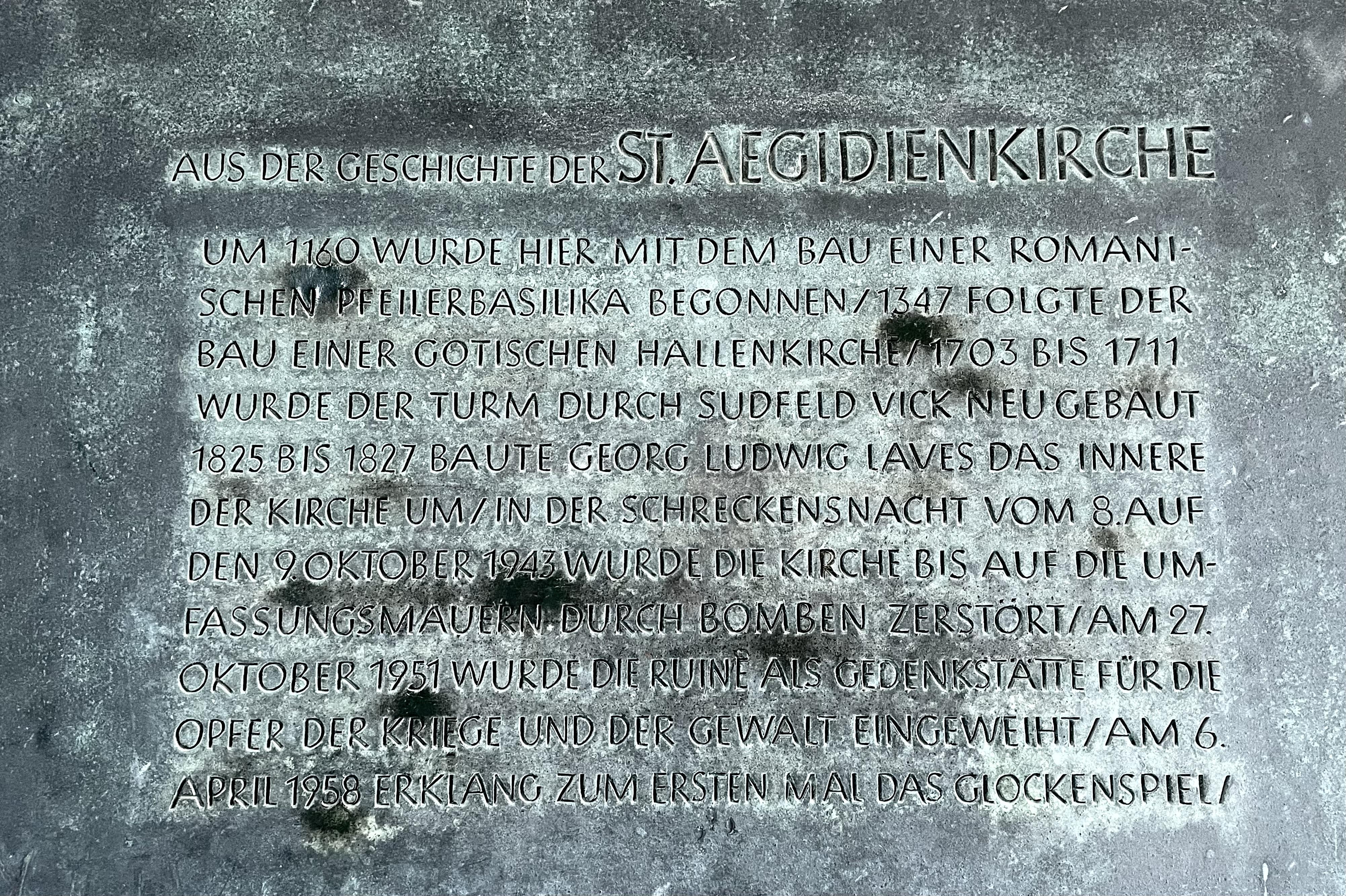 Die „St. Aegidienkirche“ ist ein geschichtsträchtiger Ort: Ihr Bau begann bereits im 12. Jahrhundert. Im Herbst 1943 wurde sie bei einem Bombenangriff bis auf die Umfassungsmauern zerstört. Heute dient die Ruine als „Gedenkstätte für die Opfer der Kriege und der Gewalt“ – so formuliert es eine Gedenktafel im Eingangsbereich.
