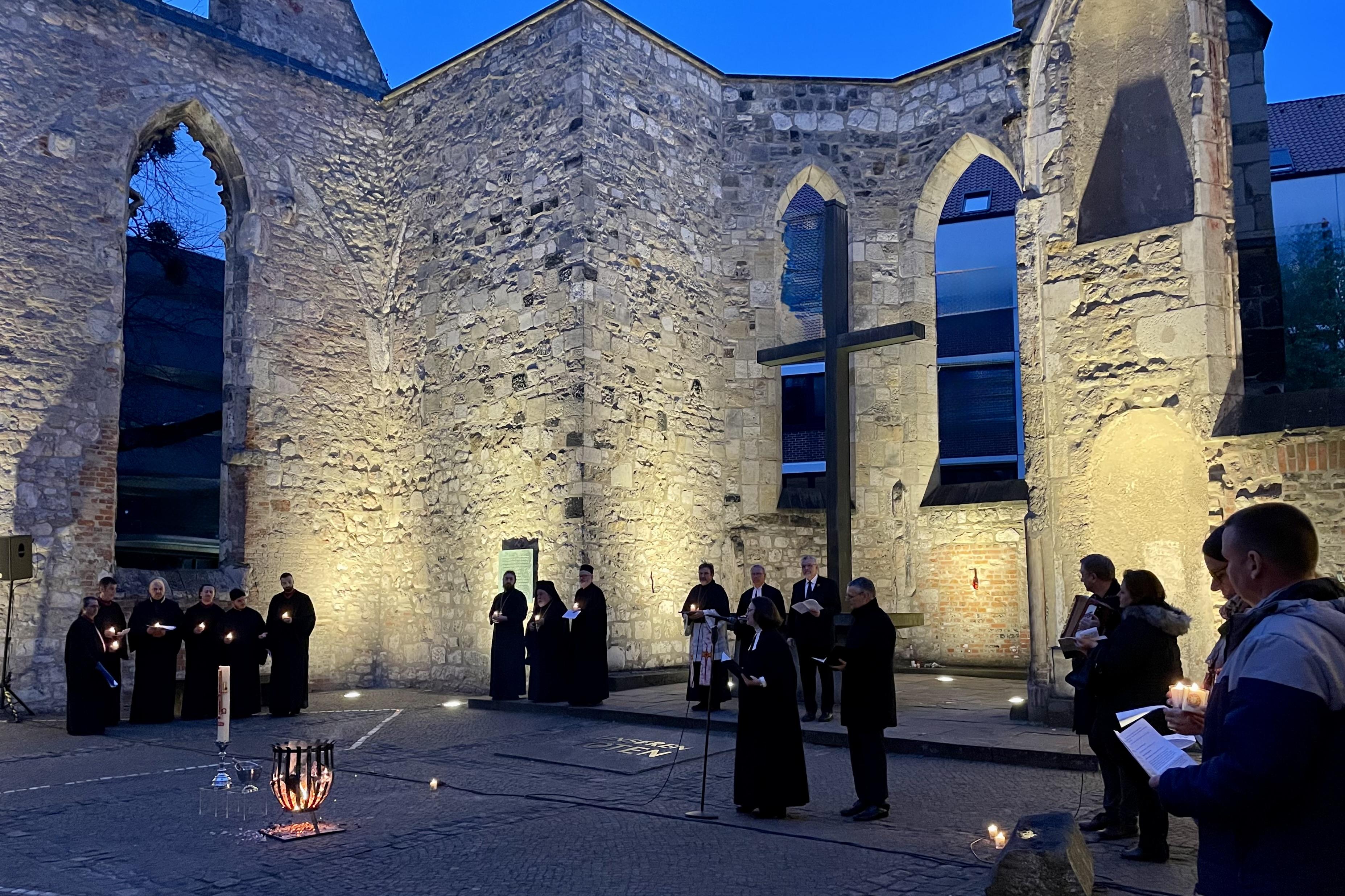 Umso erfreulicher war es, dass auch im Jahr 2026 ein gemeinsamer Termin für einen ökumenischen Ostergottesdienst gefunden werden konnte: der Tag, an dem die Ostkirchen in diesem Jahr Ostern feierten. In der eindrucksvollen Atmosphäre der Ruine der Aegidienkirche wurde es zu einem Fest in großer konfessioneller Vielfalt.